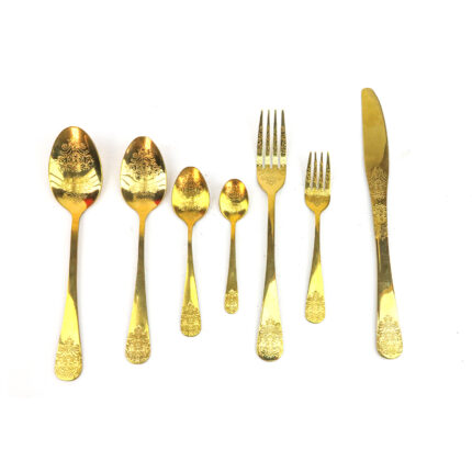 طقم ديال أدوات المائدة مُتكامل، كايتميز بـ اللون الذهبي و الزخرفة الدقيقة. كايتكون الطقم من 4 أنواع: 🍴 معالق كبار:
