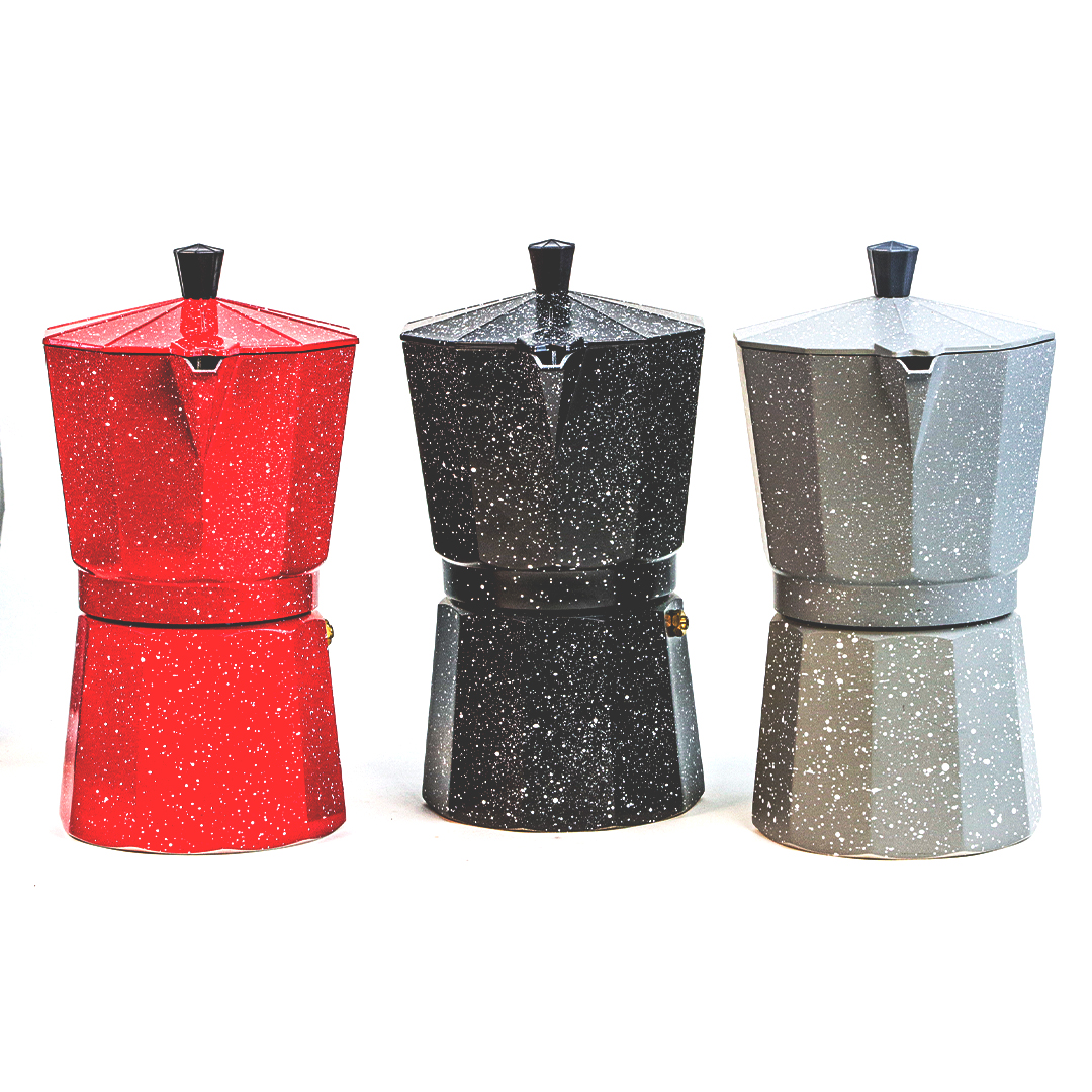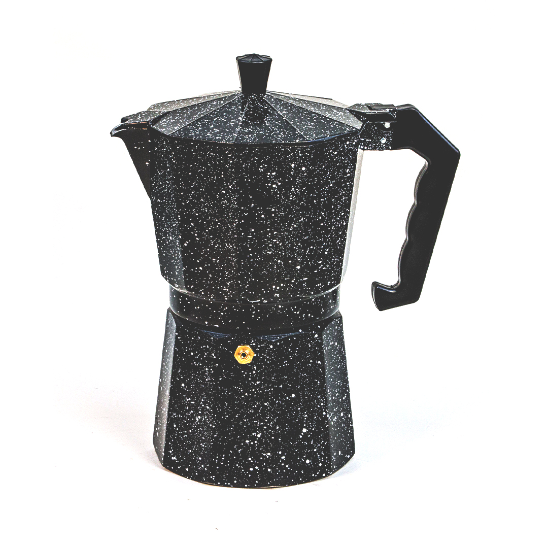 بريق (آلة) ديال القهوة تقليدي و عملي، كايخدم بالبخار باش يعطي قهوة قاصحة و بْنينة. البراد مصنوع من معدن قوي، وْالغطا ديالو من برا فيه طلاء أسود غرانيت (بحال الرخام) مزوّق بنقيطات بيضين، وْكايعطيه منظر أنيق و كايحميه من الصدا. الفوق ديال البراد فيه نقش ديال المثلثات (هندسي)، و الغطا ديالو كايتشد مزيان باش يحافظ على القهوة سخونة. اليد (المقبض) ديال البراد كبيرة و قاصحة، وْكايْصْبَرْ على الحرارة باش تهزيه بْـالأمان.
