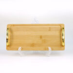 صينية (بلاطو) بشكل مستطيل و عندها حافة صغيرة، مخصصة لـ تقديم المشروبات و الوجبات الخفيفة. مصنوعة من خشب البامبو الطبيعي، لونو فاتح و كايعطي منظر دافئ و عصري. الخشب ديالها قاصح و كايصبر على الماء والإستعمال اليومي. البلاطو فيه جوج ديال اليدّات (المقابض) على الجناب، لونهُم ذهبي لامع و مُزوق، اللي كاتسهل عليك باش تهزيه بأمان و كايزيدوه أناقة.