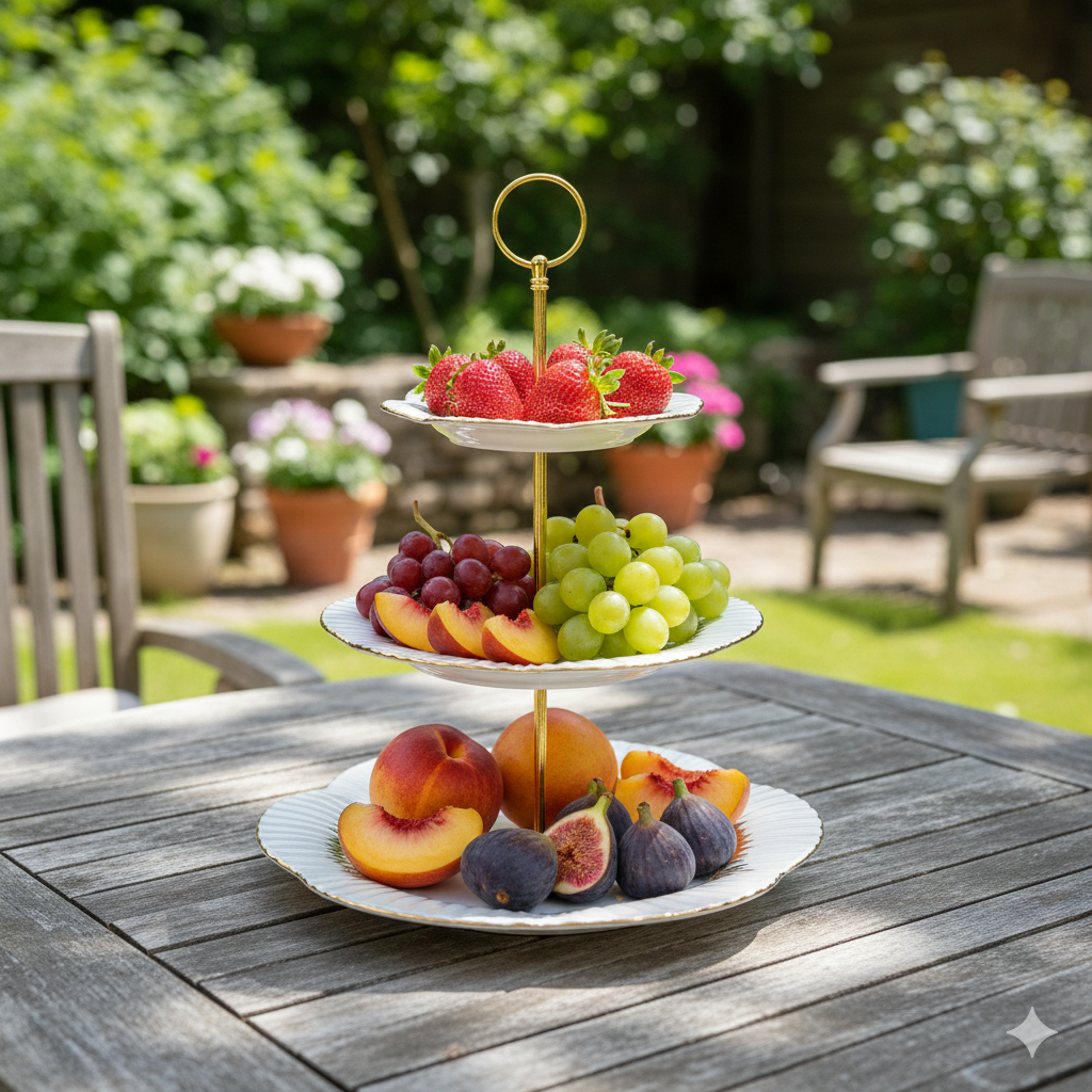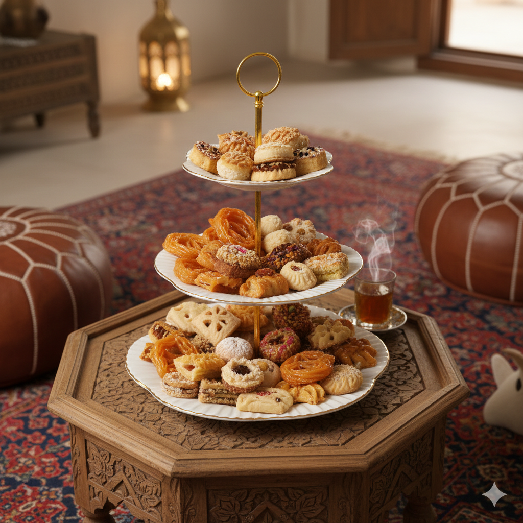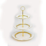 حامل ديال الحلويات فيه ثلاثة ديال الطباسل (الأطباق) مركبين فوق بعضياتهم باش يوفر البلاصة فوق الطبلة. الطباسل مصنوعين من البلاستيك (الخزف) النقي، و الجناب ديالهم مزوّقين بـخطوط ذهبية، و العْمود اللي شادهم لونو ذهبي و فـالراس ديالو حلقة ذهبية.