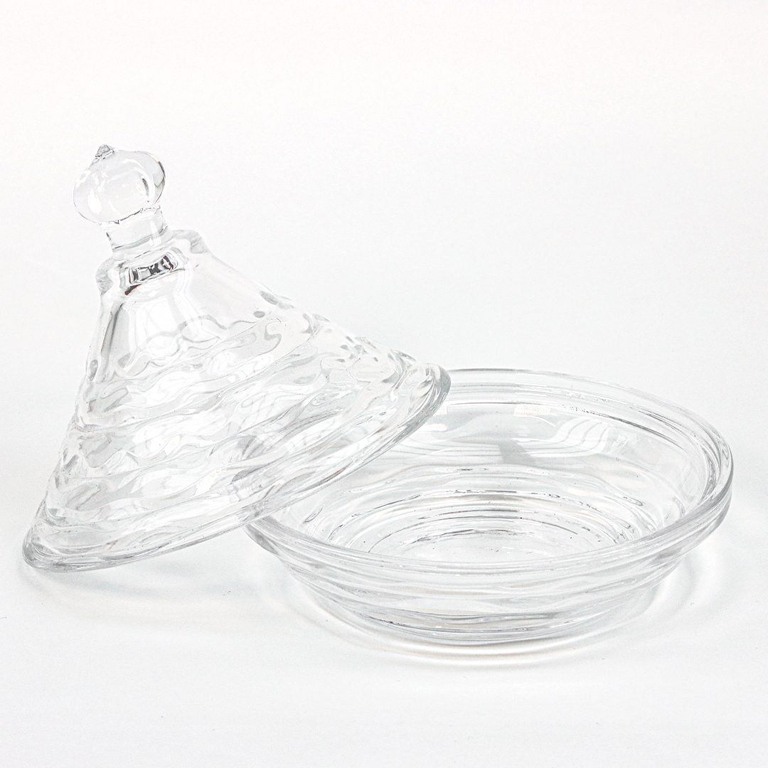 طاجين صغير مَصْنُوع من الزّجاج الشفاف والمَتين ديال التقديم. مُصَمَّم على شكل طاجين مغربي، لكن بنقش خفيف على شكل أمواج اللي كتعطيه لمسة عصرية وْراقية. كيجي مُتْكَوَّن من جُوج ديال الطراف: البْلاطو التحتاني العريض، و القُبَّة اللي كتسد مزيان، وْفالراس ديالها كاين مقبض بسيط وْشَفّاف. الشكل ديالو كايْعَطِي جمالية للمحتويات اللي لداخل، حيث كايْبان التمر ولا الحلوى بْشكل أنيق.