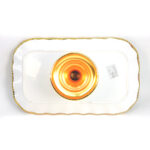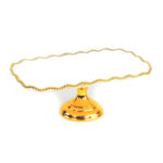 طبق ديال تقديم الحلوى كبير، مَصنوع من بلاستيك، والقاعدة ديالو والجناب ديالو مصبوغين بـاللون الذهبي اللامع. الطبق ديالو دائري، والجناب ديالو مزوّقين بحفيرات صغار على شكل عقيقات ذهبية، اللي كتعطي واحد المنظر ديال الأناقة الكلاسيكية. القاعدة ديالو غليظة و قاصحة، وْكتخلي الطبق ثابت فوق الطبلة وكتهزّ الكيكة كاملة بالأمان.