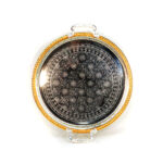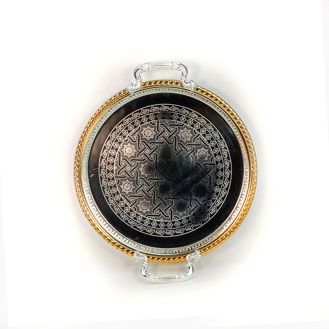 طقم ديال جوج صواني، وحدة كبيرة وحدة صغيرة، مُخصص للتقديم التقليدي. الصواني دائرية، لونها فضي (Silver) مع نقش هندسي تقليدي مُزخرف فـالوسط. الحافة ديال الصينية مُزينة بـإطار ذهبي مُجدول (كايشبه الضفيرة)، وهادشي كايعطيها منظر ديال الفخامة. عند الصواني جوج ديال اليدّات (مقابض) كبار فـالجناب لـسهولة الحمل، و لونهم فضي.