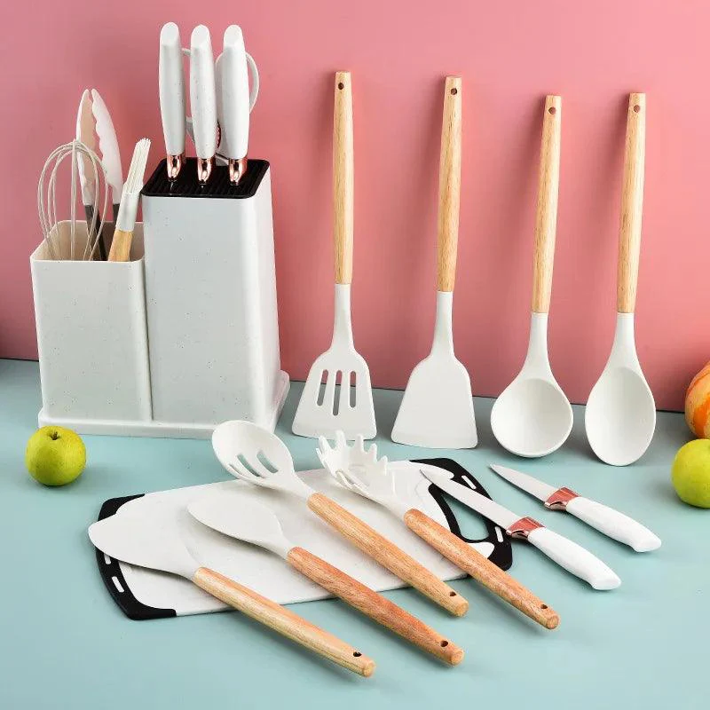طقم فيه بزاف ديال الأدوات الضرورية فالكوزينة (مغارف، سباتولا، مغرفة ديال السباكيتي، مصفاة، سكاكين…)، كلّهم بيدّات ديال العود (الخشب) مركّبة فالوسط. الرؤوس ديال الأدوات مصنوعة من بلاستيك قاصح (سيليكون) لونو أسود، كايصبر على السخونية وما كايجرحش المقالي اللي فيهم غطا ما كيلصقش. الطقم كيجي معاه حامل (علبة) ديال الإينوكس (معدن فضي) اللي كايخلّي الأدوات مرتّبين وواقفين فالبوطاجي. اليدّات ديال الأدوات كتعطيهم لمسة طبيعية و مريحة فالشدة وكايصبرو على الحرارة.
