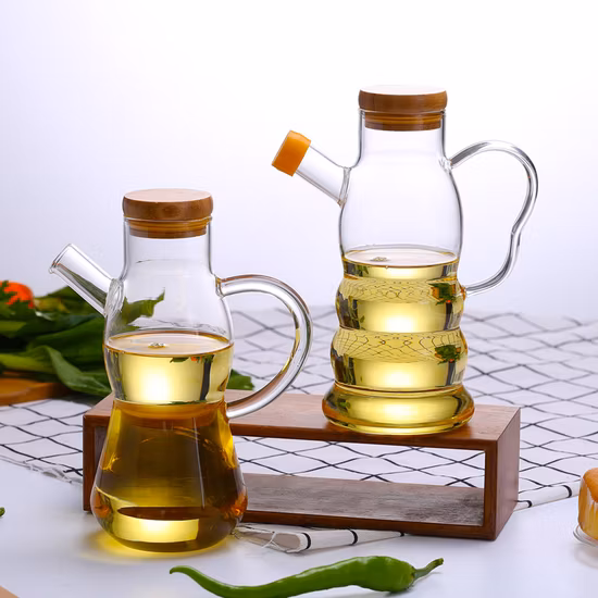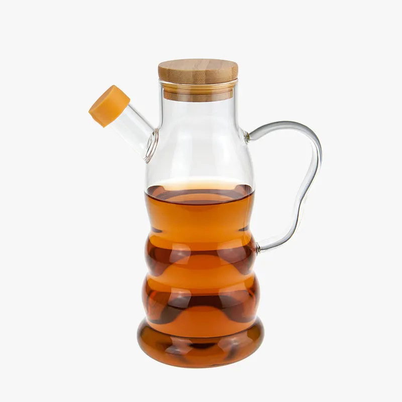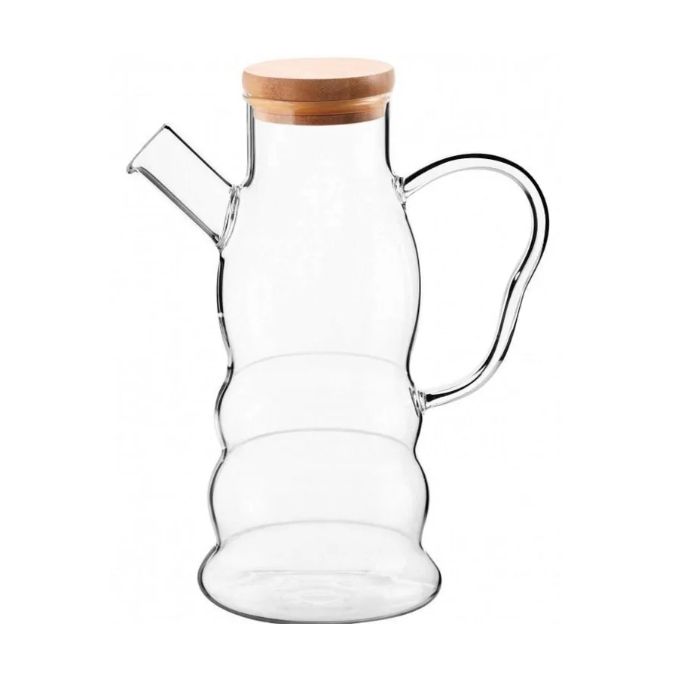 طقم فيه جوج ديال القراعي (أباريق) مصنوعين من زاج نقي وْصحي، وْكيجي محطوط فوق قاعدة ديال الخشب (العود) زوينة و مريحة. الزاج ديال القراعي فيه انحناءات (مواج) خفيفة وْزوينة اللي كتخلّيهم يشدّوا مزيان فاليد وكتعطيهم شكل عصري. كُل إبريق عندو فم جانبي مْغَطّي بغطاية برتقالية (ولا بلاستيكية) باش تكبي الزيت وْالخل بدقّة وما يتخوّاش بزاف. القاعدة ديال العود كتجمع القراعي بجوج وكتحمي الطبلة، وكتعطيهم منظر أنيق فْـالكوزينة ولا فوق الطبلة.