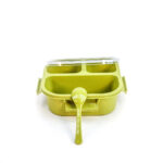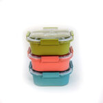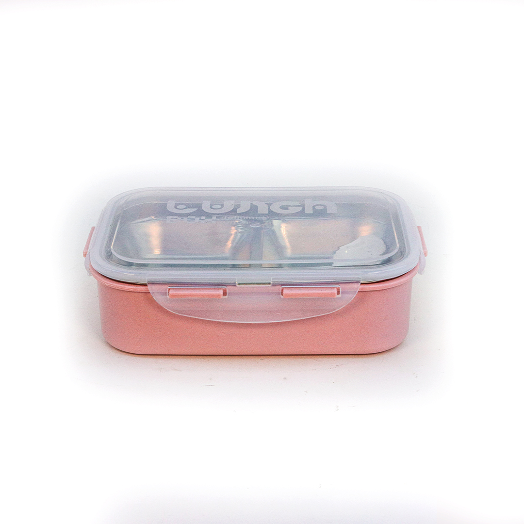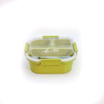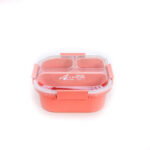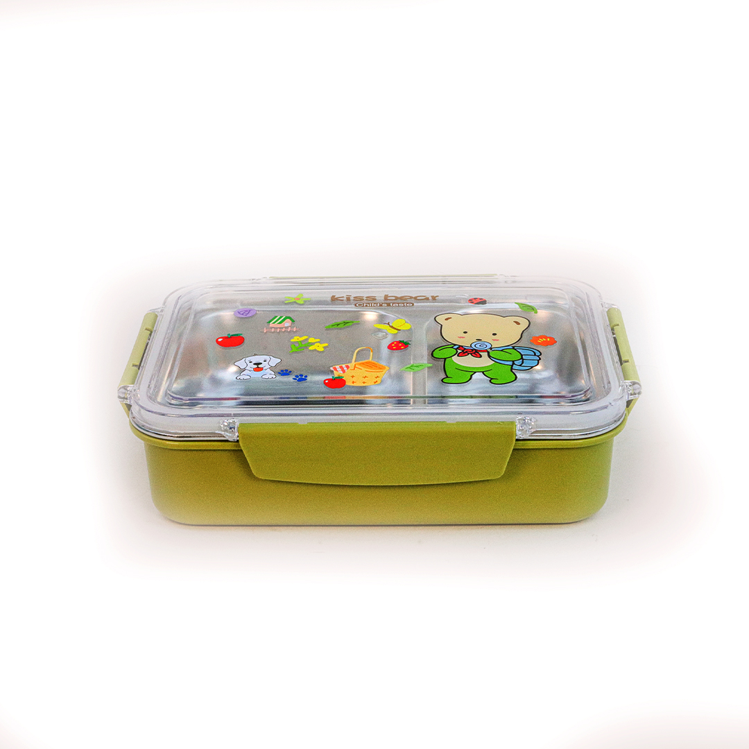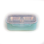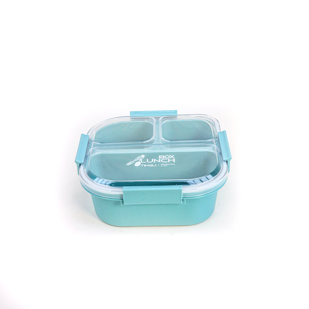 علبة مُخصصة لـ حمل الغداء و الوجبات، و يُفترض أنها متوفرة بـ أحجام مختلفة (كبير و صغير) حسب طلبك. الصندوق (القاعدة) مصنوع من بلاستيك قاصح، و الغطاء ديالو شفاف لـ رؤية ما يوجد بالداخل. الغطاء ديال العلبة مُصمم بـ 3 ديال الأقسام مُنفصلة، و هادشي كايخليك تحطي أنواع مختلفة من الماكلة (كـ الخبز و السلطة) بلا ما يتخلطوا. العلبة عندها جوج ديال الأقفال (Clips) باللون الأخضر فـ الجناب، باش تضمني الإغلاق المحكم و ما تسيلش الماكلة.