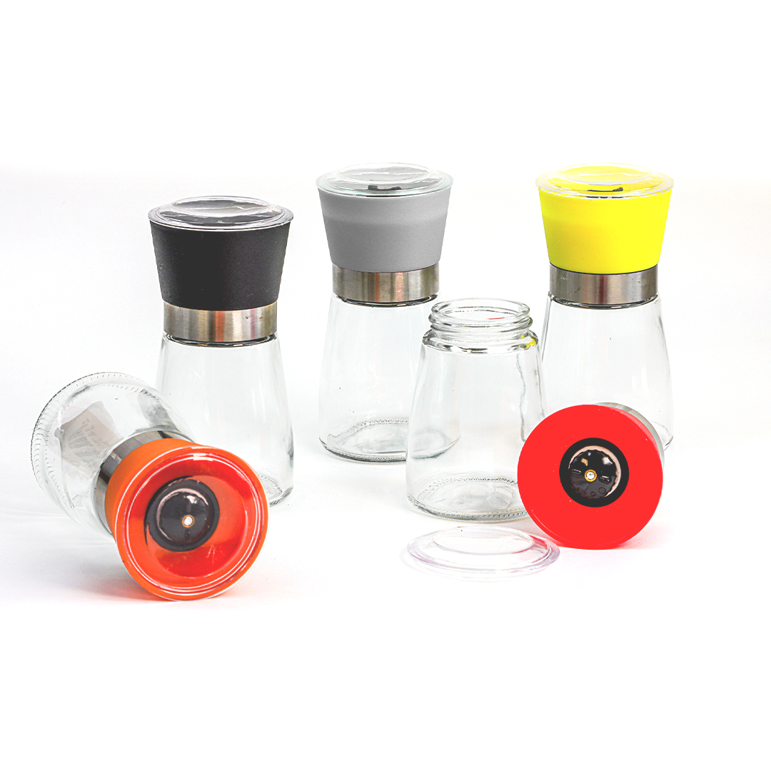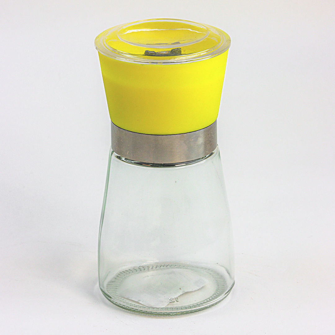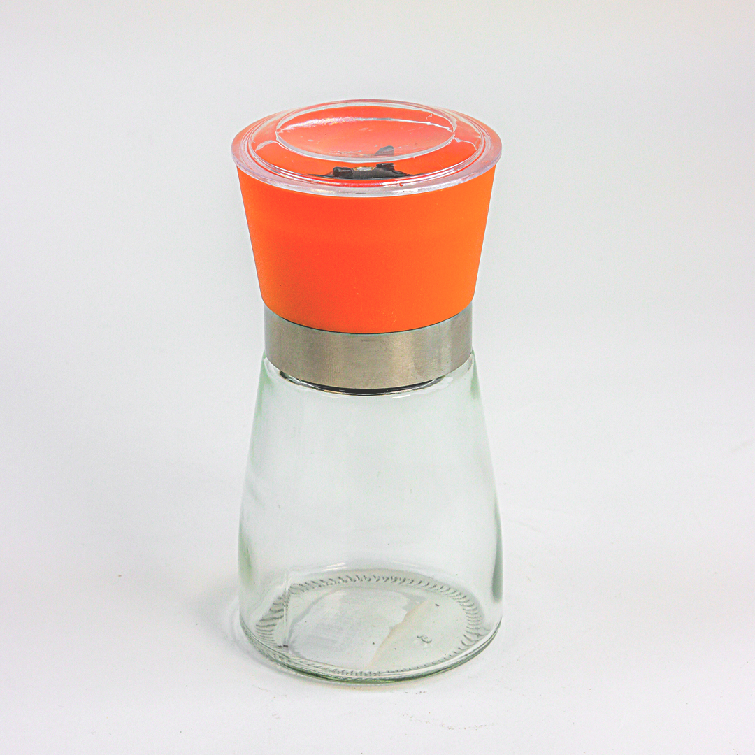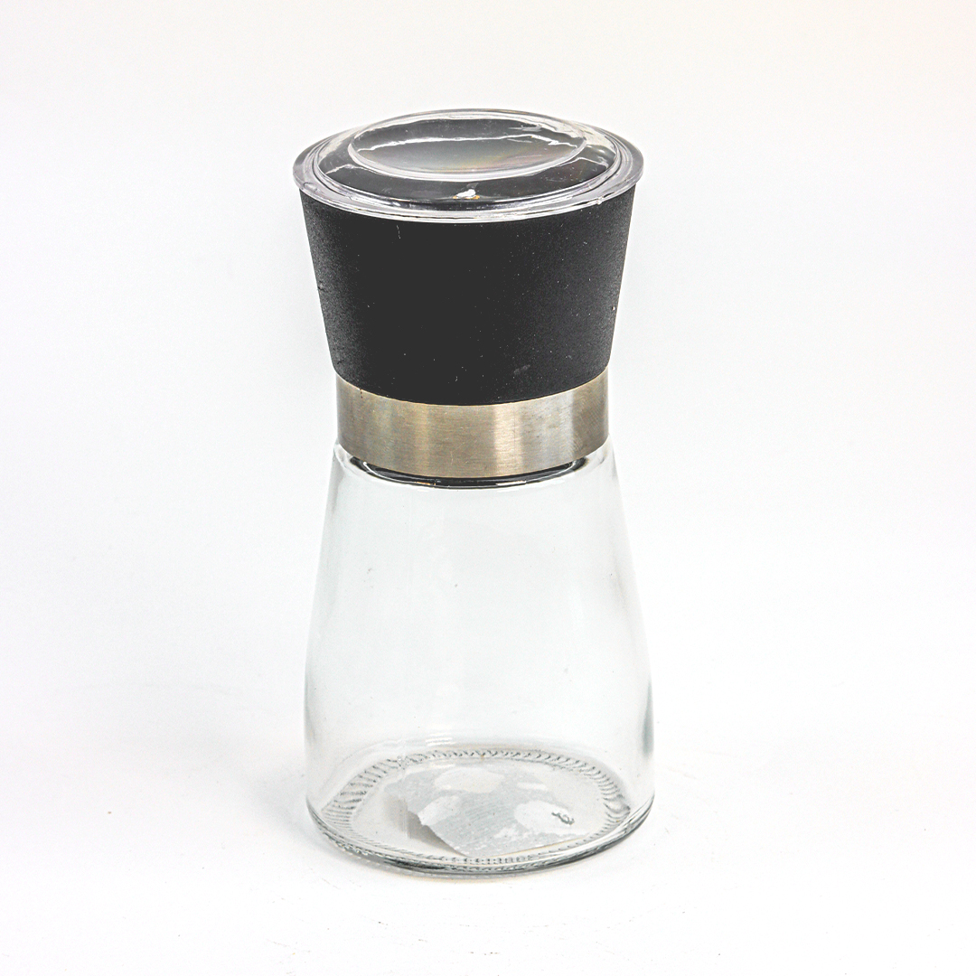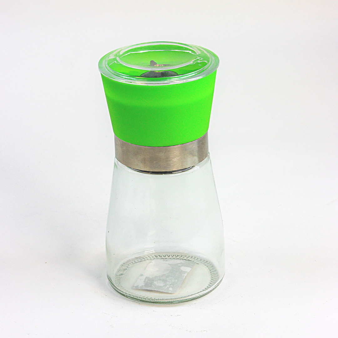 مطحنة صغيرة كتخدم باليد، ديال طحين الملحة الغليظة، البزار، و التوابل الاخرى اللي كتبغي تطحنيها جديدة. مصنوعة من زجاج نقي و قاصح فالجسم ديالها، و الغطا ديالها بلاستيك قوي وفيه الطاحونة الميكانيكية لداخل. الشكل ديالها أنيق و عصري، كتصلح تحطيها فوق الطبلة مع الماكلة.