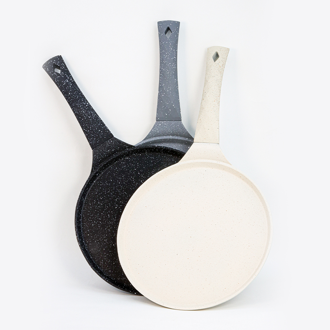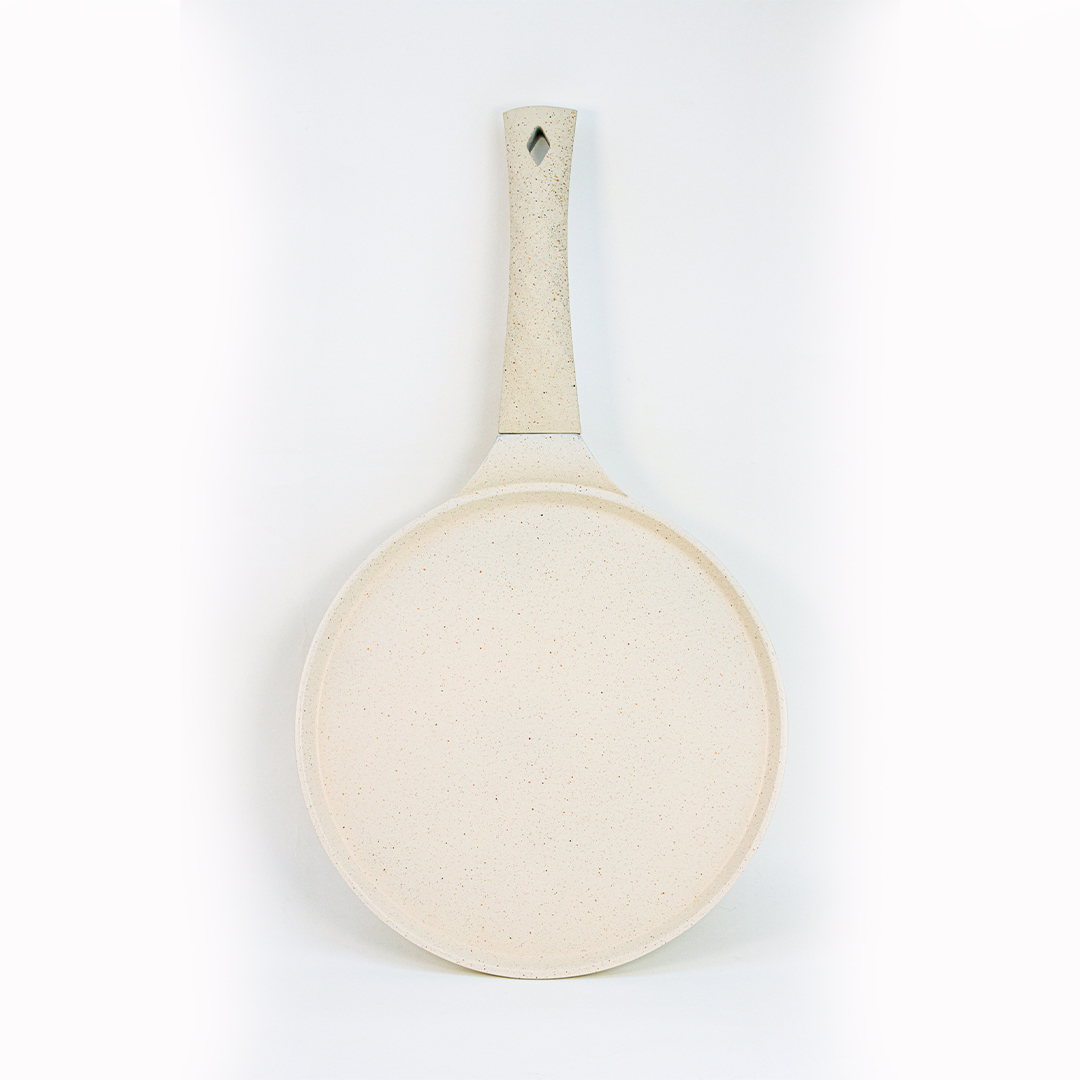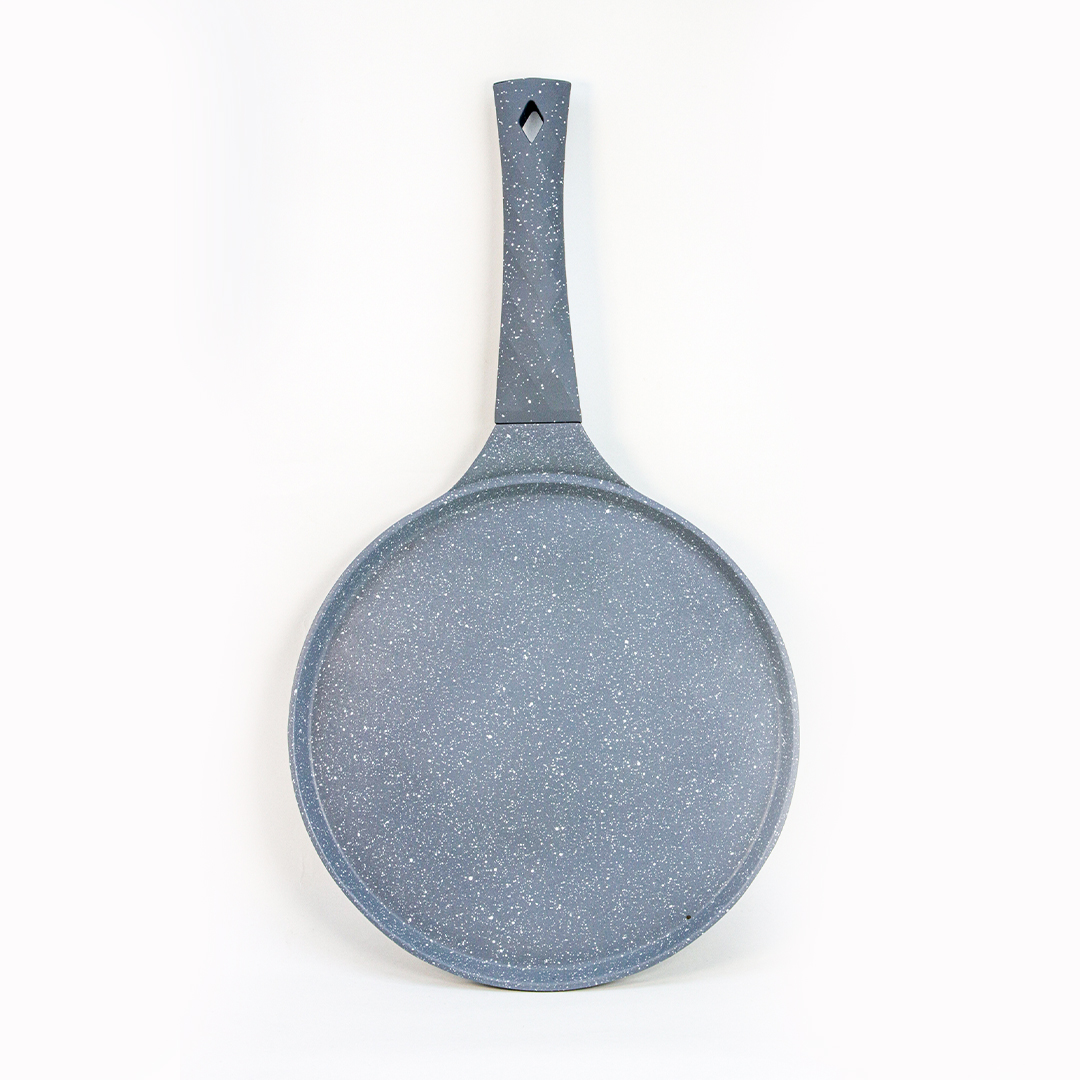 مقلة خاصة دائرية و مسطحة، كتصلح بزاف باش تصايبي البغرير، الكريب، لي بان كيك، ولا الخبز المسطح. المقلاة كلها لونها أسود مع حبيبات بيضاء (غرانيت)، اللي كتعطيها منظر أنيق وكلاسيكي. المقلاة مغطية بواحد الغطا ما كيلصقش (Non-adhésif)، اللي كيخلي الماكلة طيب بلا ما تلصق و بلا ما تحتاجي بزاف ديال الزيت.
