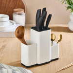 هني راسك من الروينة ديال المواس اللي مشتتين في المجر ومن خطر الجروح. هاد المنظم العملي هو الحل باش تجمعي كاع أدوات التقطيع في بلاصة وحدة آمنة ومنظمة، وبلمسة عصرية بلونه الأبيض الأنيق.