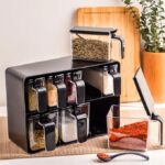 منظم فيه 9 علبة (6 صغار و3كبار) بلاستيكية شفافة، مصممة باش تنظمي كل أنواع التوابل ديالك (العطرية). كل علبة عندها غطا رمادي/دخان اللون، كايتحل من الفوق باش تعمريها، و كايتحل من التحت باش ترشي التوابل مباشرة. الإطار الخارجي ديال المنظم قاصح و مصمم باش يتعلَّق (يتفيكسا) فْـالحائط ولا يتحط فوق البوطاجي.