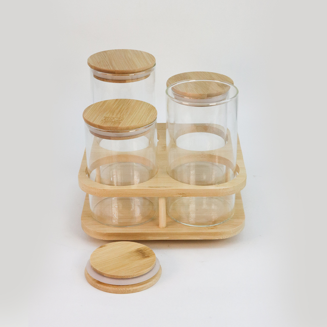 🔵 برطمانات زجاجية: كيجي معاه 4 ديال البرطمانات زجاجية شفافة، بـ أغطية محكمة ديال الخشب (البامبو) باش تحافظي على العطرية طرية.