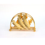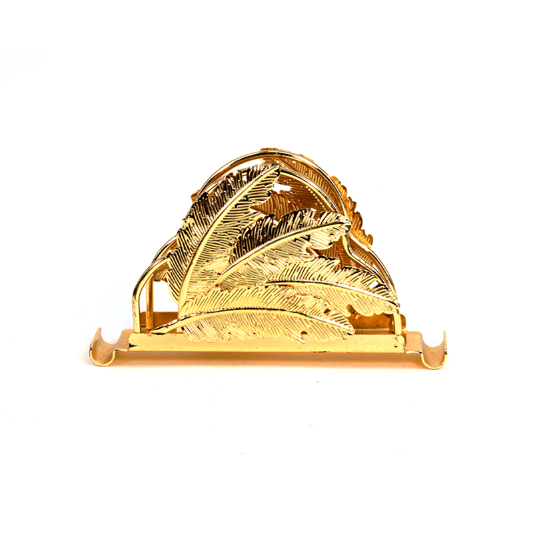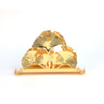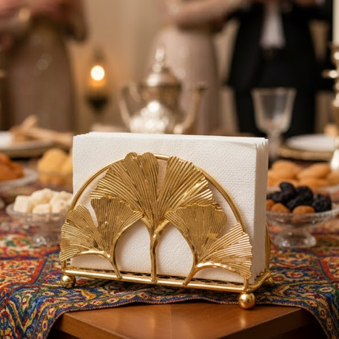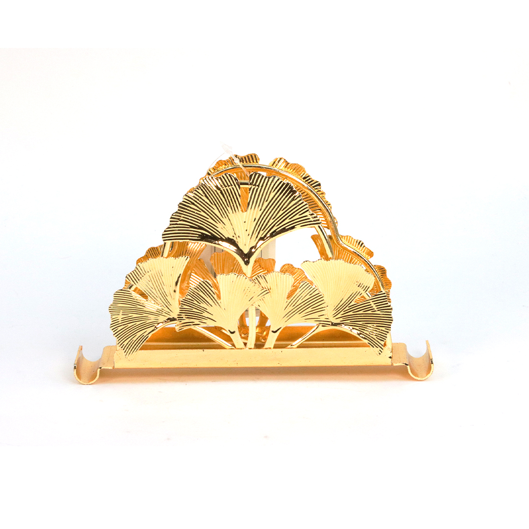حامل ديال المناديل الورقية (كلينكس) ولا الفوطات الصغيرة، مصنوع من المعدن لونو ذهبي لامع. التصميم ديالو مزوّق بـنقش ديال أوراق شجرة الجنكو (على شكل مروحة)، اللي كايعطي منظر فخم و راقي للطبلة. عندو قاعدة مستطيلة ثابْتَة، وكاتوقف على 4 ديال الكُرات ذهبية باش يكون مرفوع وْما يتزْلَقْشْ.